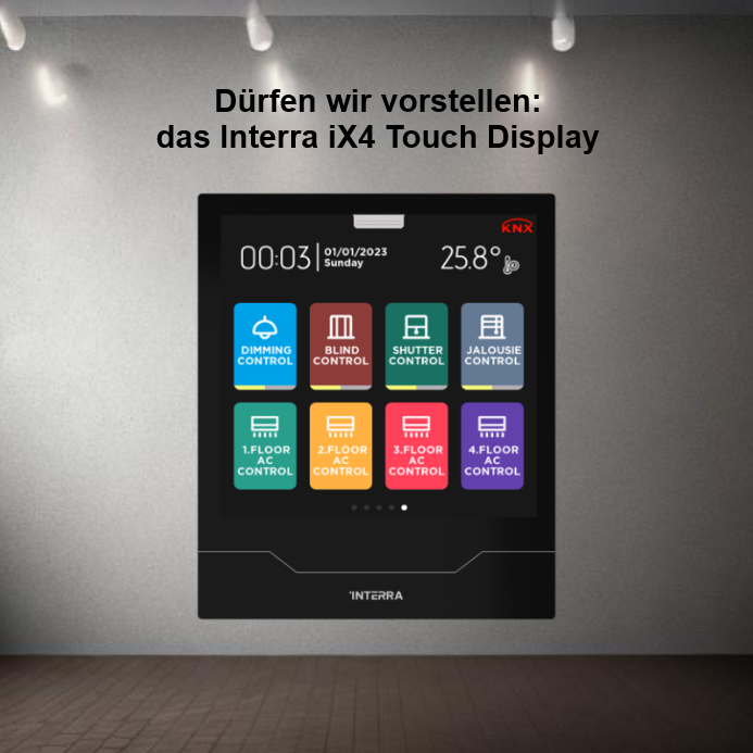 Erlebe die Zukunft des Smart Living mit dem iX4 Touch Display von Interra! Steuere dein Smart Home intuitiv, personalisiere bis zu 20 Funktionsseiten und genieße das brillante Display. Jetzt erhältlich – deine Eintrittskarte zur Innovation!